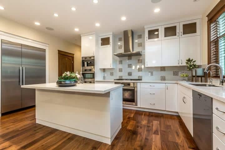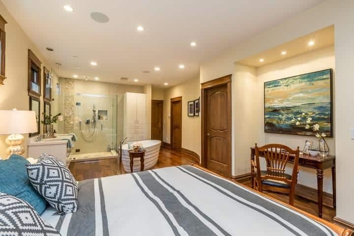 Two story layout with finished basement includes 5 bedrooms, 5 bathrooms, radiant in-floor heating, solid walnut floors, custom high end cabinetry, solid wood moldings and doors, high end appliances and custom finishes throughout.
